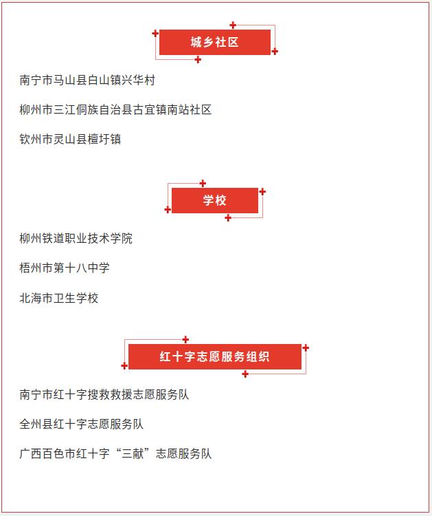 近日,中国红十字会总会印发关于表彰全国红十字模范单位的决定,决定授予99个城乡社区、99个学校、100个红十字志愿服务组织、52个机关企事业单位、19个冠名红十字医疗机构“全国红十字模范单位”称号。其中,广西