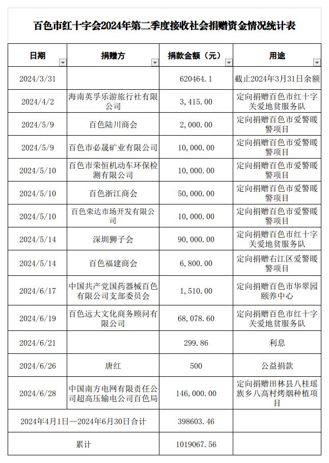 百色市红十字会 2024年接收社会捐赠资金情况公示 (4月1日—6月30日)