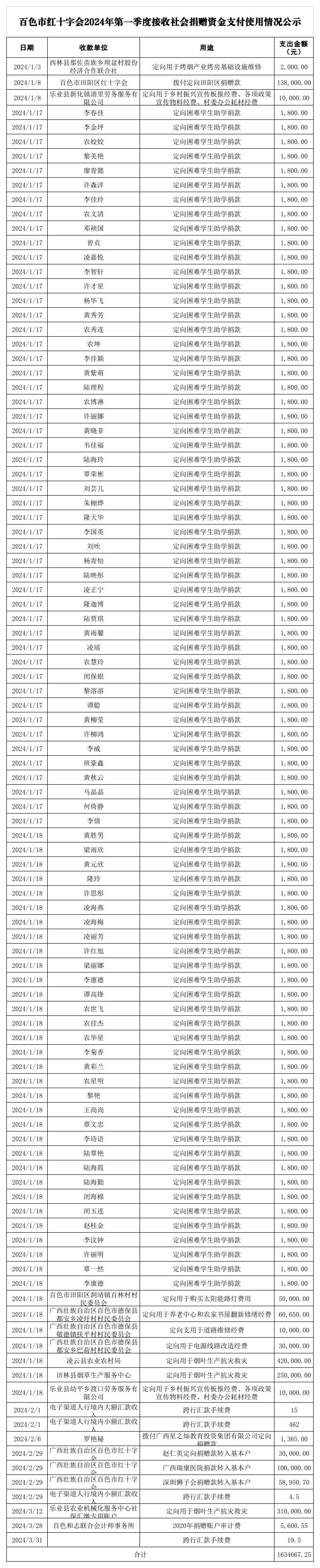 2024年1月1日—3月31日,百色市红十字会支出社会捐赠资金1634667.25元。