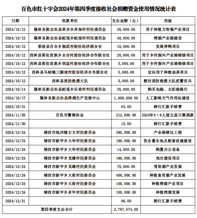 百色市红十字会2024年10月1日—12月31日接收社会捐赠资金使用情况公示
